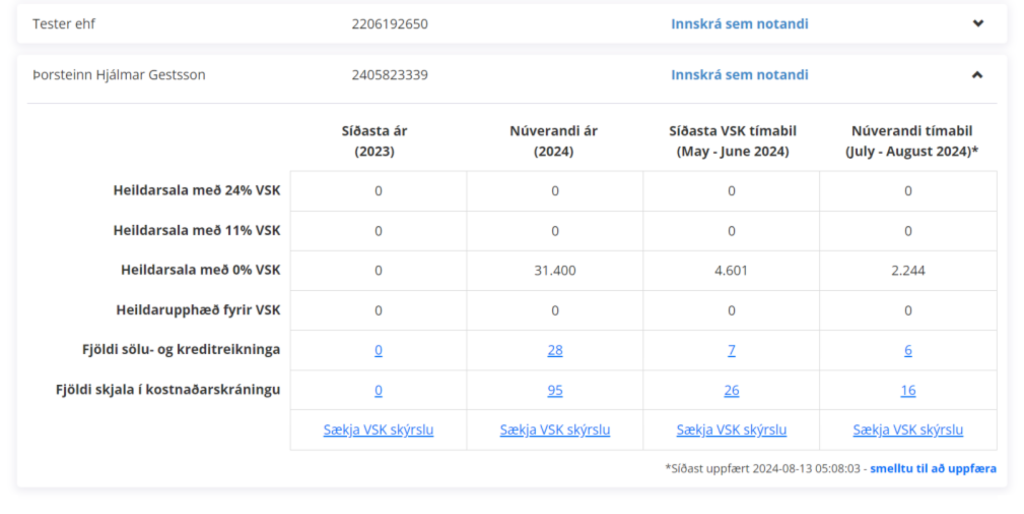 Í stjórnborðinu getur þú einnig skoðað lykiltölur um viðskiptavin, sótt VSK skýrslu eða kostnaðarreikninga beint úr stjórnborðinu. Þeir valmöguleikar birtast ef smellt er á píluna lengst til hægri í hverri línu.