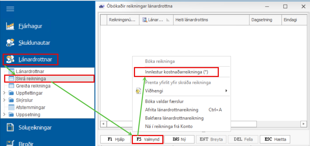 Til að lesa kostnaðarreikningana síðan inn í DK þá velur þú Lánadrottnar > Skrá reikninga > F5 Valmynd > Innlestur kostnaðarreikninga (*)