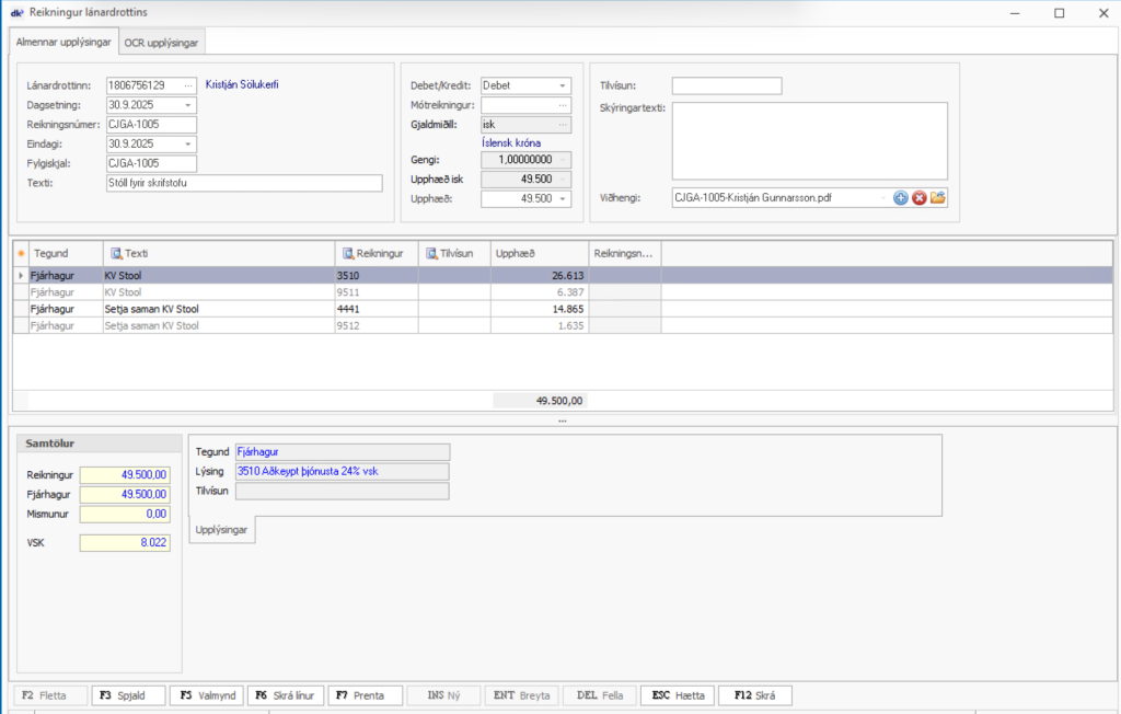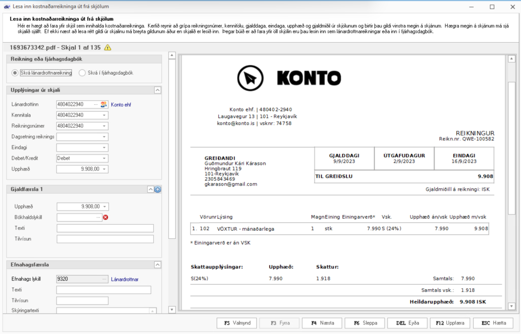 OCR Lesarinn í DK reynir þá að grípa kennitölu seljanda, reikningsnúmer, eindaga, upphæð og gjaldmiðil. Þú ferð síðan yfir hvort að þessar upplýsingar séu rétt og bætir við því sem vantar.